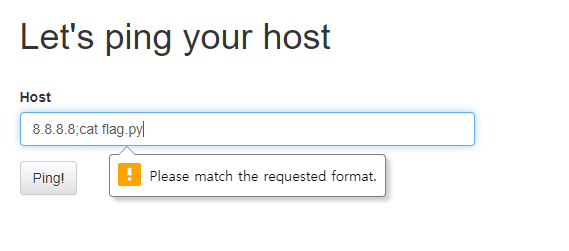 pattern="" 이 부분에서 형식에 맞게 출력 방식임을 알 수가 있다. 즉 HTML 소스코드를 편집하여 패턴을 없애면 Command injection 코드를 수행할 수 있을지도 모른다.