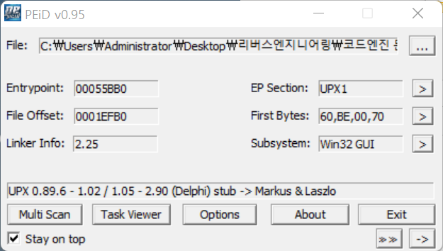 PEID 툴을 활용하여 보면 UPX로 패킹이 되어있는 것을 볼 수가 있다.