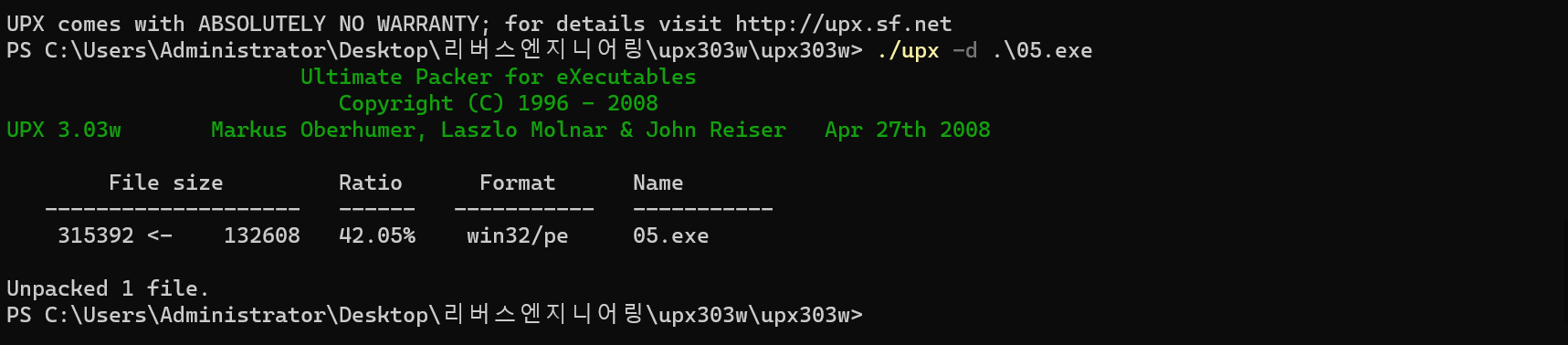 upx 툴을 사용하여 언패킹을 해보자.