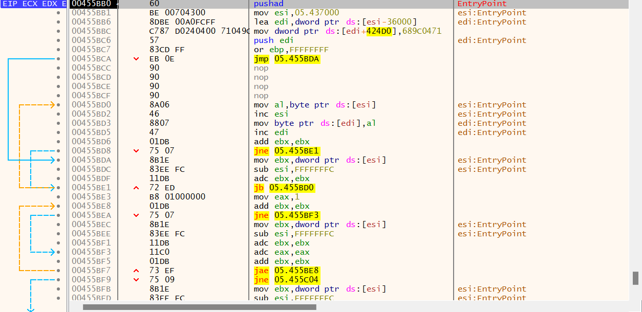 그렇게 쭉 분석을 하였는데 자동실행시 중간에 걸린다. pushad 로 계속 막히는 것을 볼 수 있었는데 느낌이 쎄해서 패킹이 되어있는지 확인해 보기로 했다.