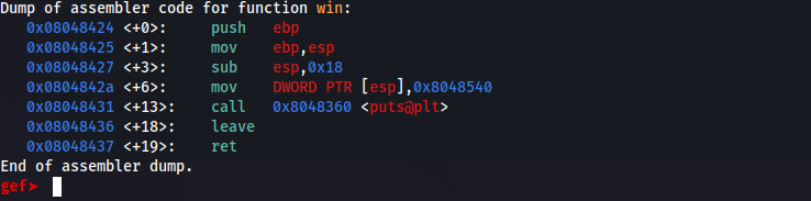 win 함수의 주소가 0x08048424 인것을 확인할 수 있다.