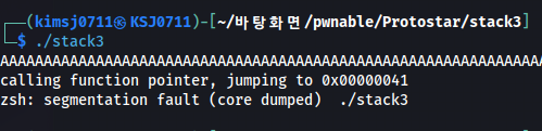 다음과 같이 함수 포인터가 0x00000041 로 이동되었다는 것을 확인할 수 있다. ++ (ffp 값이 0이 아니게 되어 해당 문자열을 출력 한다.)